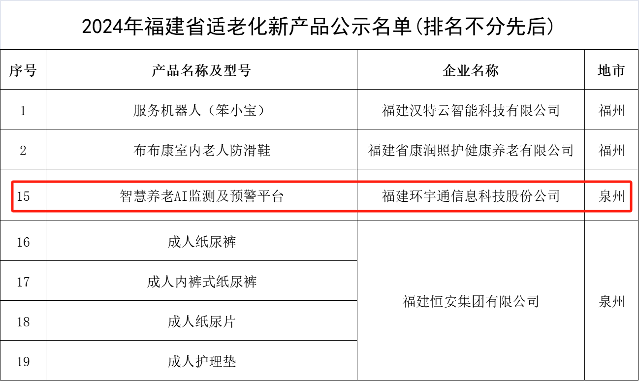 2024年11月19日,2024年福建省适老化新产品公示名单公布,全省有24款产品位列名单,泉州共有五款产品入选。其中 ■澳门十大棋牌排行榜最新■澳门十大棋牌排行榜推荐 依托技术积累和创新能力所推出的“智慧养老AI监测及预警平台”入选该名单。这一荣誉不仅是对公司在“AI+医疗康养”领域的长期努力和贡献的肯定,更是对未来持续创新与高质量开展的激励。